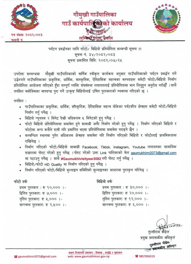 पर्यटन प्रवर्द्धनका लागि फोटो/ भिडियो प्रतियोगिता सम्बन्धी सूचना !!!