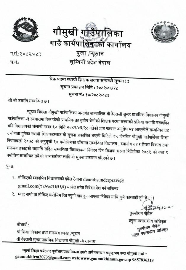 थप जानकारीको लागी मोवाईल नं 9857833980 मा सम्पर्क गर्नुहोला ।